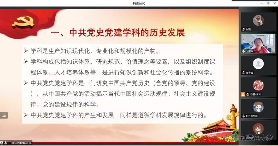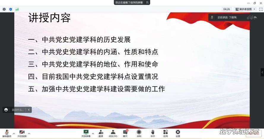 中国共产党是一个具有深远历史眼光的马克思主义政党,欧冠直播app 历来高度重视党史党建的学习教育及学科建设。2022年11月23日,辽宁师范大学政府欧冠直播 邀请国家“万人计划”教学名师、武汉大学丁俊萍教授,线上为学院师生做了题为“中共党史党建学科建设的若干问题”的专题报告。政府欧冠直播 任春雷院长主持报告。学院师生百余人线上参与了这次学术报告。