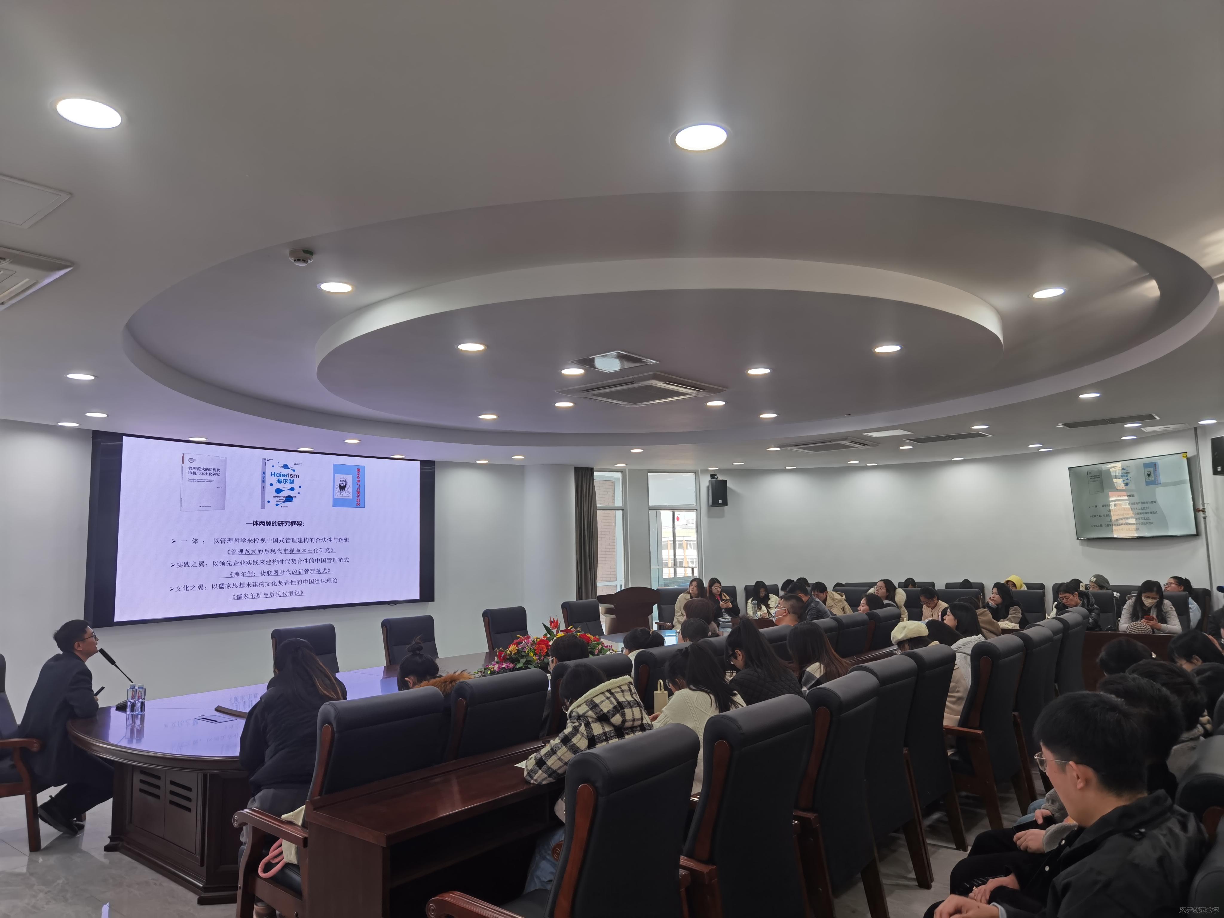 在互动交流环节中,与会师生就研究方向确定、研究方法的选择等方面内容进行提问,胡国栋和参会师生围绕相关问题进行了深入探讨。最后,赵维良对会议内容进行总结,希望学院师生对学术研究与论文撰写保持足够的耐心与定力,努力汲取经验、不断收获成长。